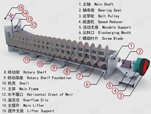 螺旋分級機(jī)主要用于選礦廠分級設(shè)備,與球磨機(jī)配套使用,形成閉路磨礦、分級閉路作業(yè)。主要由傳動(dòng)裝置、螺旋絞龍、槽體、升降機(jī)構(gòu)、下部支座(軸瓦)和排礦閥組成。