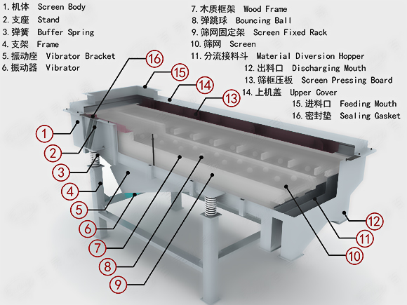 直線振動(dòng)篩利用振動(dòng)電機(jī)激振作為振動(dòng)源,使物料在篩網(wǎng)上被拋起,同時(shí)向前作直線運(yùn)動(dòng),通過(guò)多層篩網(wǎng)產(chǎn)生數(shù)種規(guī)格的篩上物、篩下物,分別從各自的出口排出,適合于流水線作業(yè)。